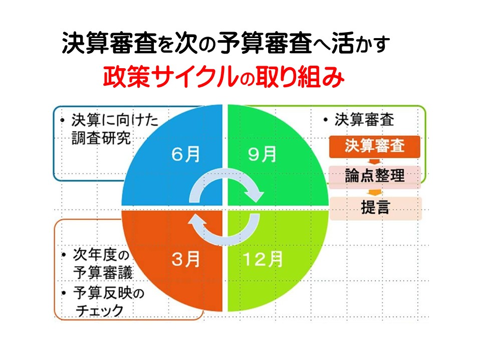 監査委員による「ルール通りか」のチェックとは異なり、私たち議会は、事業の執行が「効果的か」「効率的かどうか」、市民の目線で「暮らしに役立ったか」「無駄がなかったか」という視点などから審議しています。将来の予算編成に反映させるための重要な役割があります。