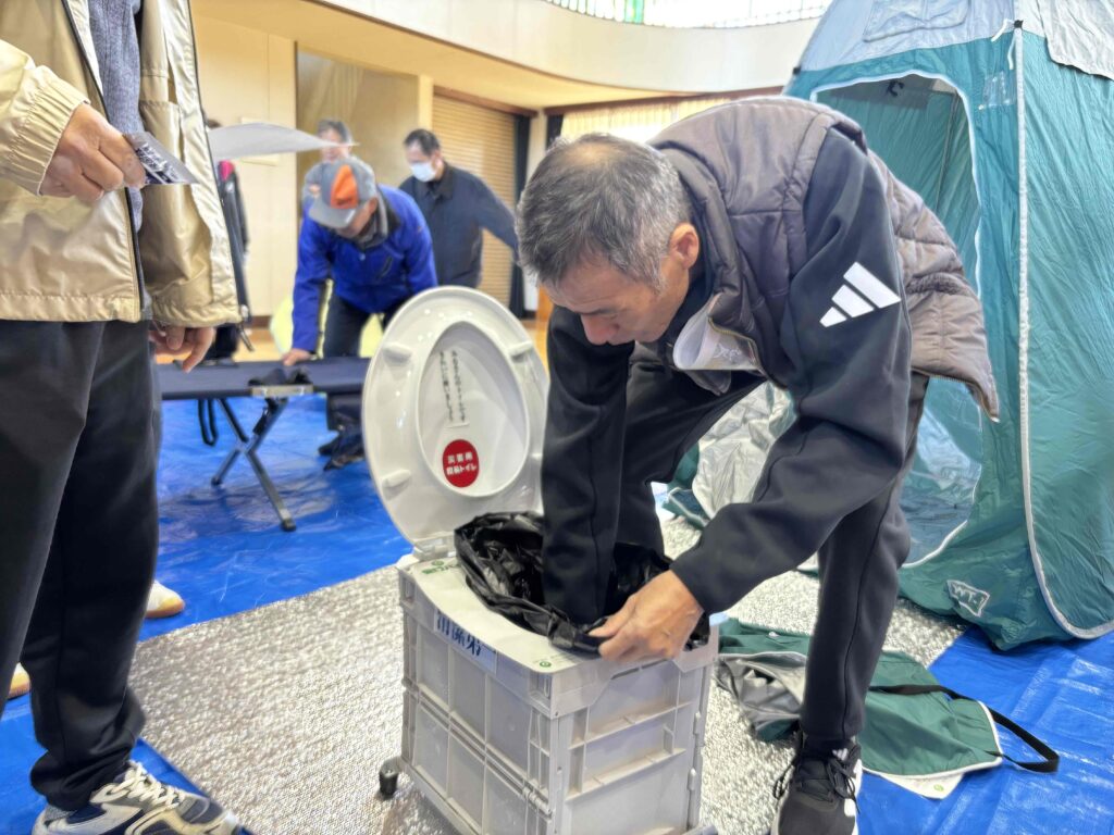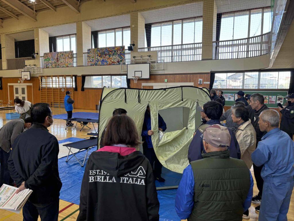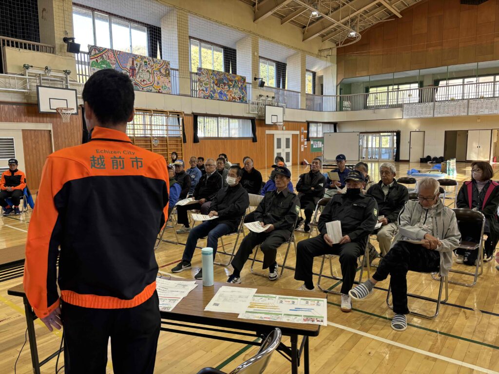 この日は、越前市危機管理課の大谷課長をはじめ、北日野小学校体育館と万葉中学校体育館の市の広域避難所開設担当職員と、自治振興会役員・理事・区長・実行委員・安全防災部員などが集まり、備蓄物資の確認、受付の準備、避難者の誘導、避難スペースの設営、トイレ対策、自家発電などを行いました。訓練を通じて、運営方法や課題を事前に把握し、実際の災害に備えることを目的としての開催です。