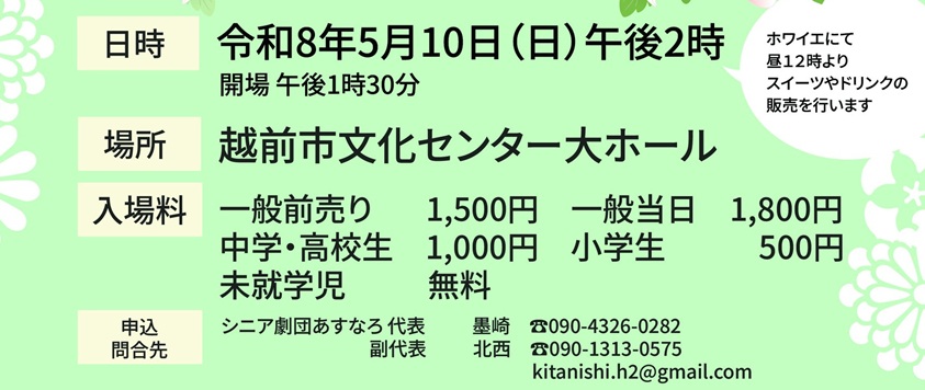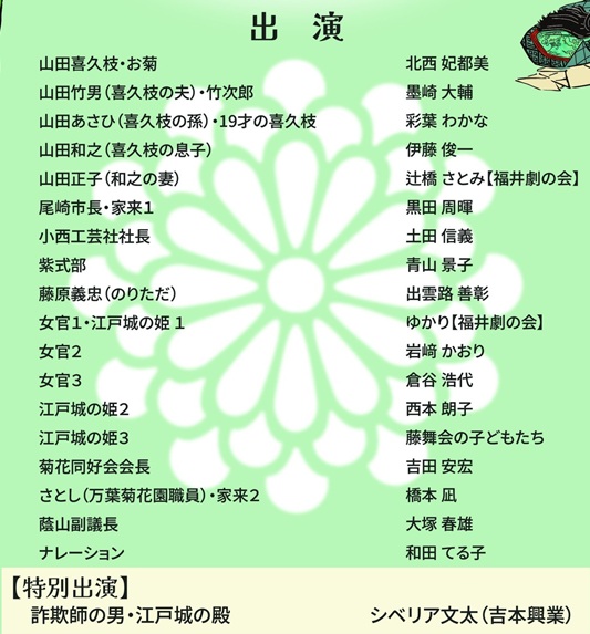この演劇には、越前市出身の吉本興業の芸人「シベリア文太」が、特別出演します。詐欺師の男役と江戸城の殿様役です。どんな展開になるのでしょう。なんとも楽しみです。