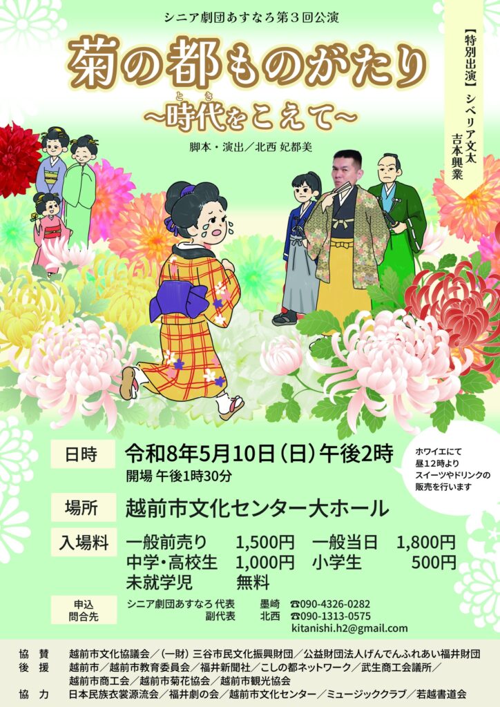 現在、本市自慢の「菊」や、「たけふ菊人形」の始まりにスポットを当てた取り組みが企画されています。演劇「菊の都ものがたり」~時代を超えて~の公演です。