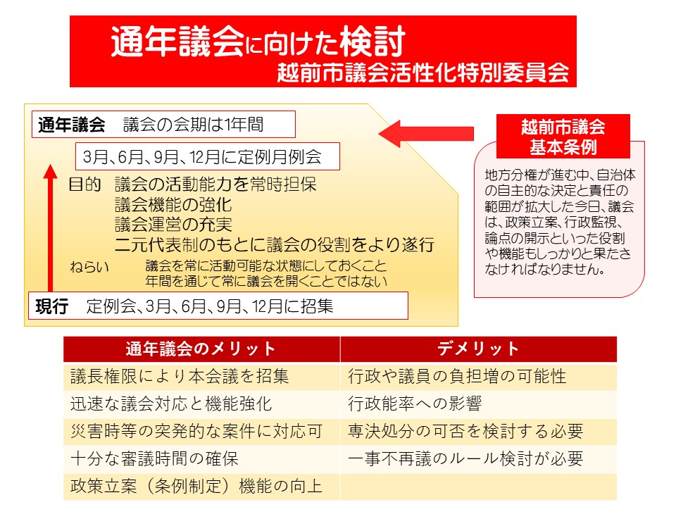 ③の通年議会については、議論を進めています。これも「地域の意思決定の中枢に進化」するには、必要なことです。